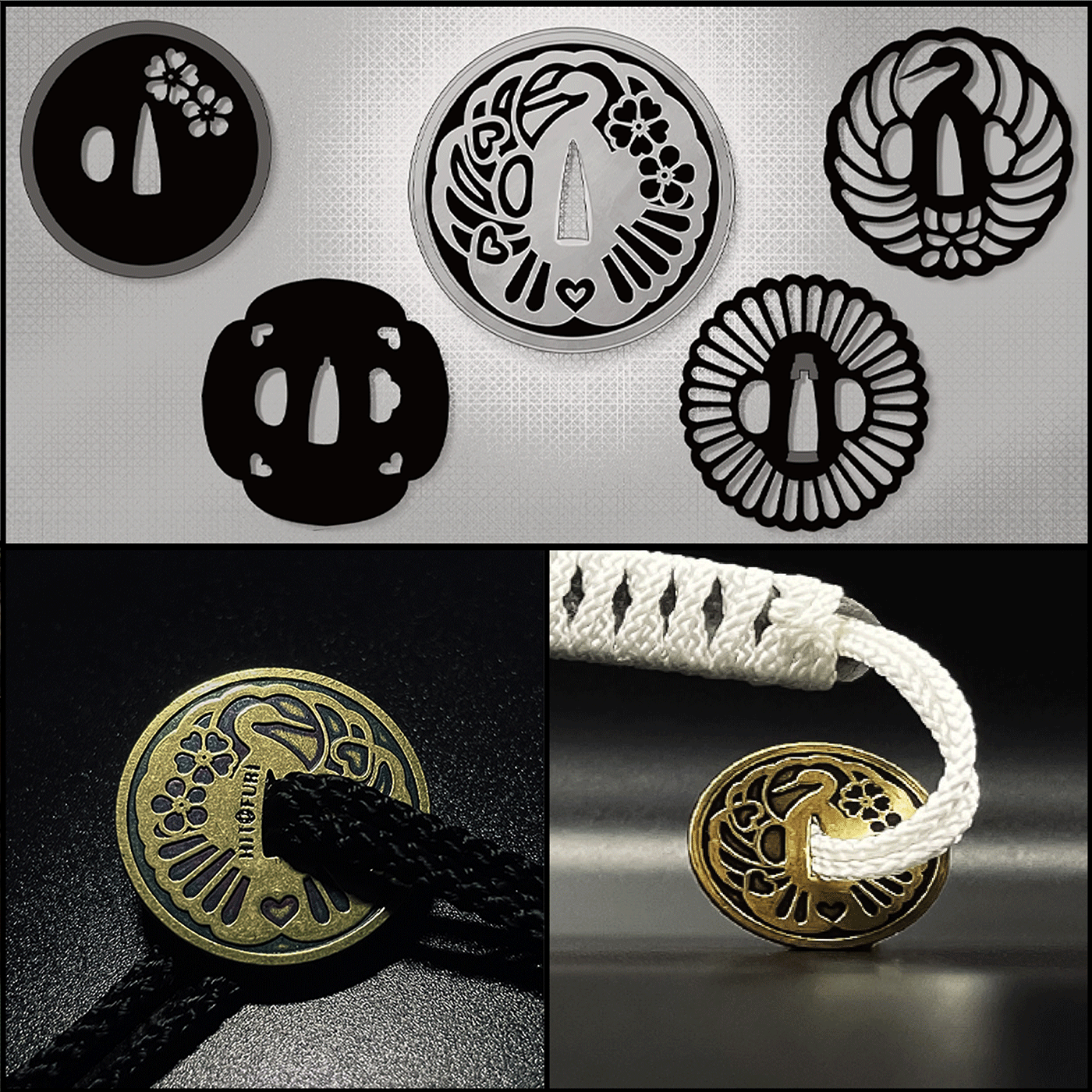 ひとふりオリジナル鐔(つば)は、伝統的なデザインの集合体から生まれました。燻(いぶ)し仕上げの装飾品が、こだわりのポイントです。あえて鐔をアクセサリーとして装着しました。